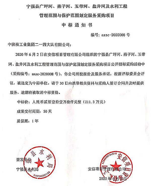 6月5日,從招標(biāo)公司獲悉,公司成功中標(biāo)“寧強縣廣坪河、燕子河、玉帶河、鹽井河管理范圍和保護(hù)范圍劃定項目”。