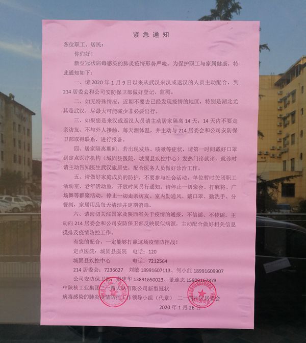 1月30日,中陜核工業(yè)集團二一四大隊有限公司新型冠狀病毒感染的肺炎疫情防控工作領導小組在城固基地組織召開了疫情防控工作領導小組會議,與二一四社區(qū)居委會、陜健醫(yī)二一四醫(yī)院三方共同對當前防疫工作進行了再安排再部署。