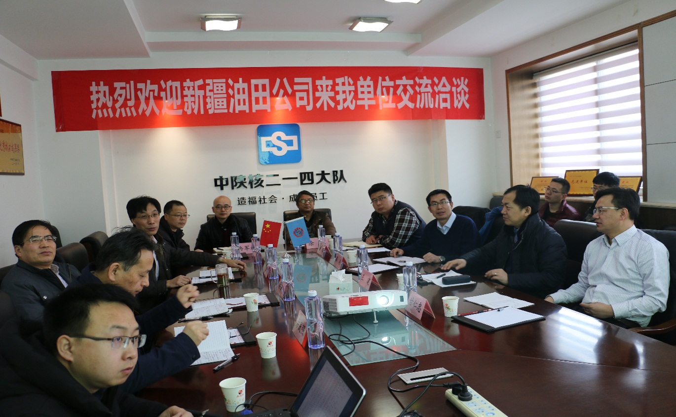 2018年2月8日,新疆油田公司勘探事業部副經理王建、西北緣項目辦經理甘仁忠及特礦中心主任薛冽一行來二一四大隊有限公司交流洽談。中陜核工業集團公司副總工程師李靠社、地質勘查部部長方民強、二一四大隊有限公司黨委書記、董事長鄧盛波、公司班子成員及西北緣項目相關人員等參加了座談交流。